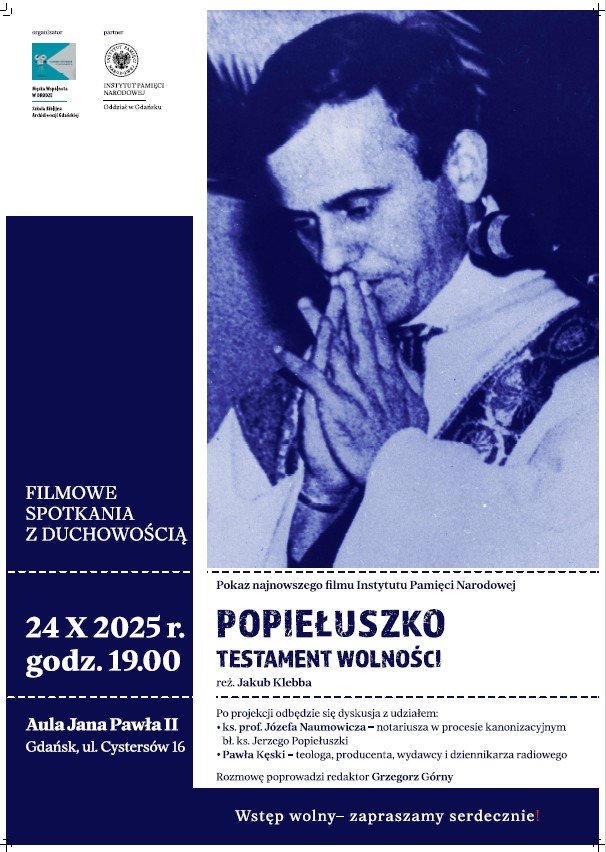 3. W piątek 24.X 2025 o godz. 19.00 w auli JPII w Gdańsku w Kurii Biskupiej odbędzie się kolejne spotkanie w ramach Filmowych Spotkań z Duchowością. Tematem będzie osoba bł. ks Jerzego Popiełuszki i najnowszy film o nim wyprodukowanym przez IPN. Po prezentacji filmu będzie rozmowa z twórcami, będzie można osobiście zadać pytania lub porozmawiać. Rozmowę poprowadzi znany redaktor Grzegorz Górny.