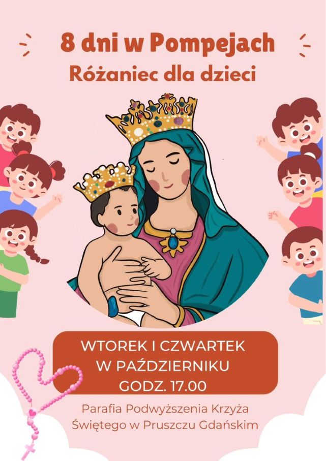 Dlatego w miesiącu październiku zapraszamy wszystkie dzieci na różańcowy program "8 dni w Pompejach", który rozpoczniemy realizować od następnego tygodnia we wtorki i czwartki o g. 17.00 - wspólna modlitwa i poznawanie życia przyszłego świętego Bartolo Longo.